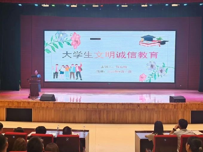 最后,许心怡老师给新生们做文明诚信教育,通过日常行为规范、违纪处分条例、评奖评优办法三个方面引导学生形成正确的行为规范,树立正向的人生观价值观世界观,培养学生的责任感,提高自身专业知识技能和综合素质,成为优秀人才。