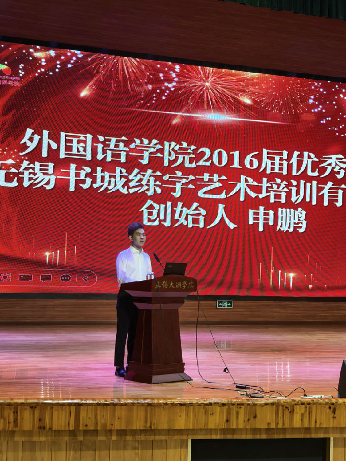 随后,由2016届优秀校友、无锡书城练字艺术培训有限公司创始人申鹏发言。