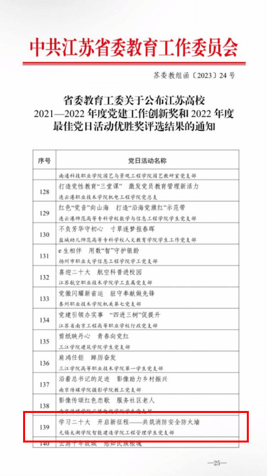 近日,中共江苏省委教育工委公布了江苏省高校2022年度“最佳党日活动”优胜奖评选结果,beat365官网党总支工程管理学生党支部申报的《学习二十大,开启新征程—共筑消防安全防火墙》荣获2022年度江苏省高校“最佳党日活动”优胜奖。