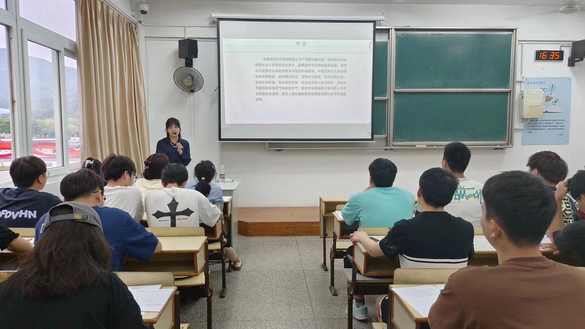 最后,由马克思主义学院党支部书记荣沁瑜进行“向着伟大复兴,知重负重再出发”讲课,她通过介绍党的二十大的主题和主要成果、过去5年的工作及新时代10年的伟大变革、开辟马克思主义中国化时代化新境界、中国式现代化、全面建设社会主义现代化国家的目标任务、坚持党的全面领导和全面从严治党这六个方面来学习贯彻党的二十大精神。她鼓励广大青年凝聚青春力量,为中华民族伟大复兴作出贡献。