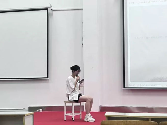 接下来是来自工管2102的李欣梅同学上台分享。她与我们分享的是房琪的《真希望你也喜欢自己》。她那充满希望的语调让我们每个人都意识到了学会自我欣赏是多么的重要。