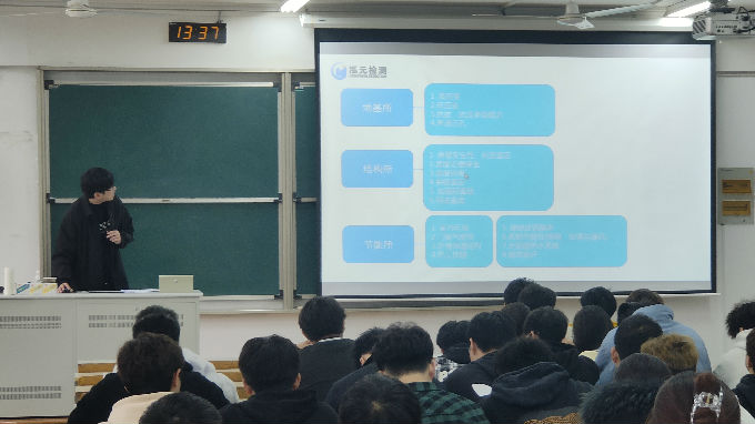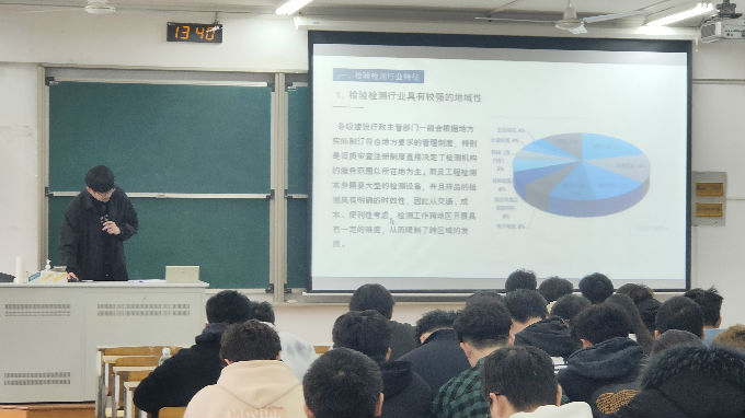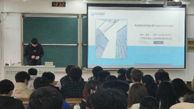 首先,陈杰先生向同学们隆重介绍了江苏泓元建设工程质量检测有限公司,展示了公司获得的部分荣誉,概括了大体的工作内容。他介绍道公司共有四个部门,分别为常规所、地基所、节能所和结构所。其次他重点讲述了建筑结构检测行业的现状与发展。陈杰表示,检验检测行业具有较强的地域性,行业日渐向绿色建设和“碳中和”发展趋势发展。且检验检测为科学研究提供“金标尺”,为产品生产提供“通行证”。近年来,我国检验检测行业的市场需求不断提升,具备优良的发展前景和广阔的下游市场空间。总结来说,社会愈加重视健康、环保等需求,这对于检验检测行业是一个难得的机遇。然后,陈杰引用了两个案例向同学们展示了检验检测行业的工作内容——既有建筑检测与鉴定,这就需要从确保各类房屋使用安全、促进城市危旧房屋改造、防火和减灾等五个方面来排除建筑隐患。最后,陈杰表示检验检测行业有优良的前景,也需要更多优秀的人才,他希望本次讲座能给同学们毕业后的发展多一个选择,多一个方向。