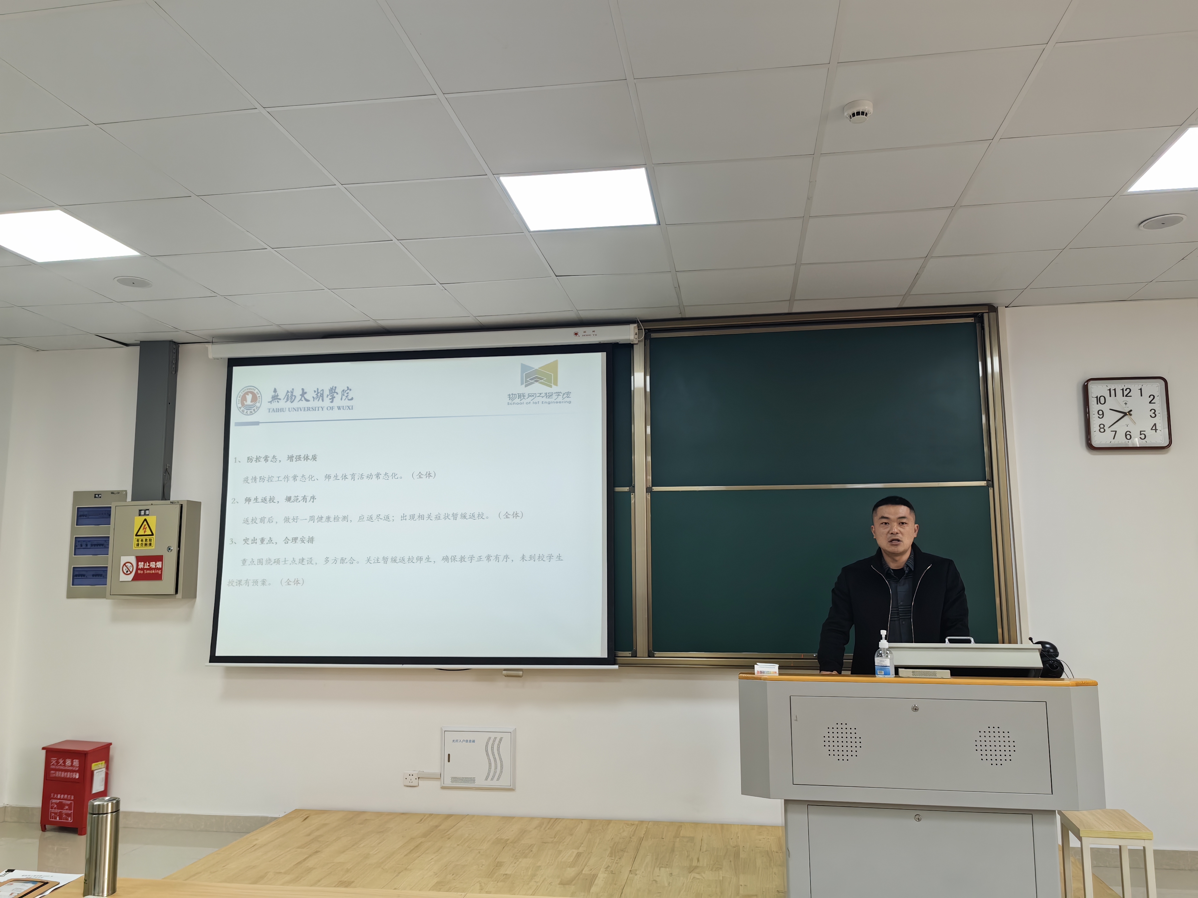 学院党总支副书记沈峰对三年来在疫情防控中师生齐心协力、积极配合所做的努力和付出表示感谢,重点强调“重回常态,重点明确”的中心思想,先后从疫情防控、学生工作、党建工作三个方面展开具体讲话,对新学期全力推进2023届毕业生就业、2024届毕业生实习工作提出具体要求。