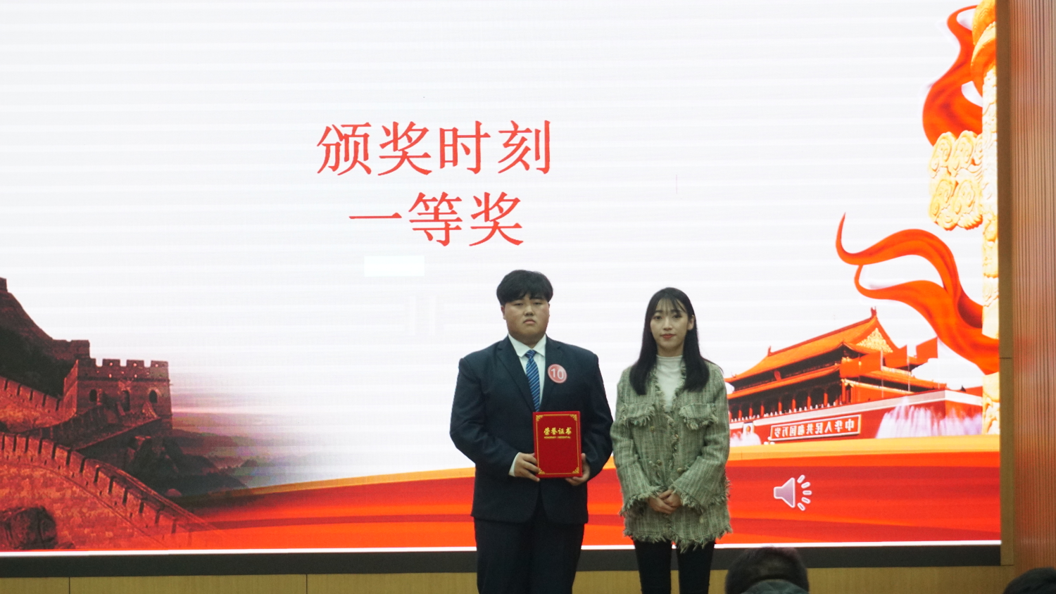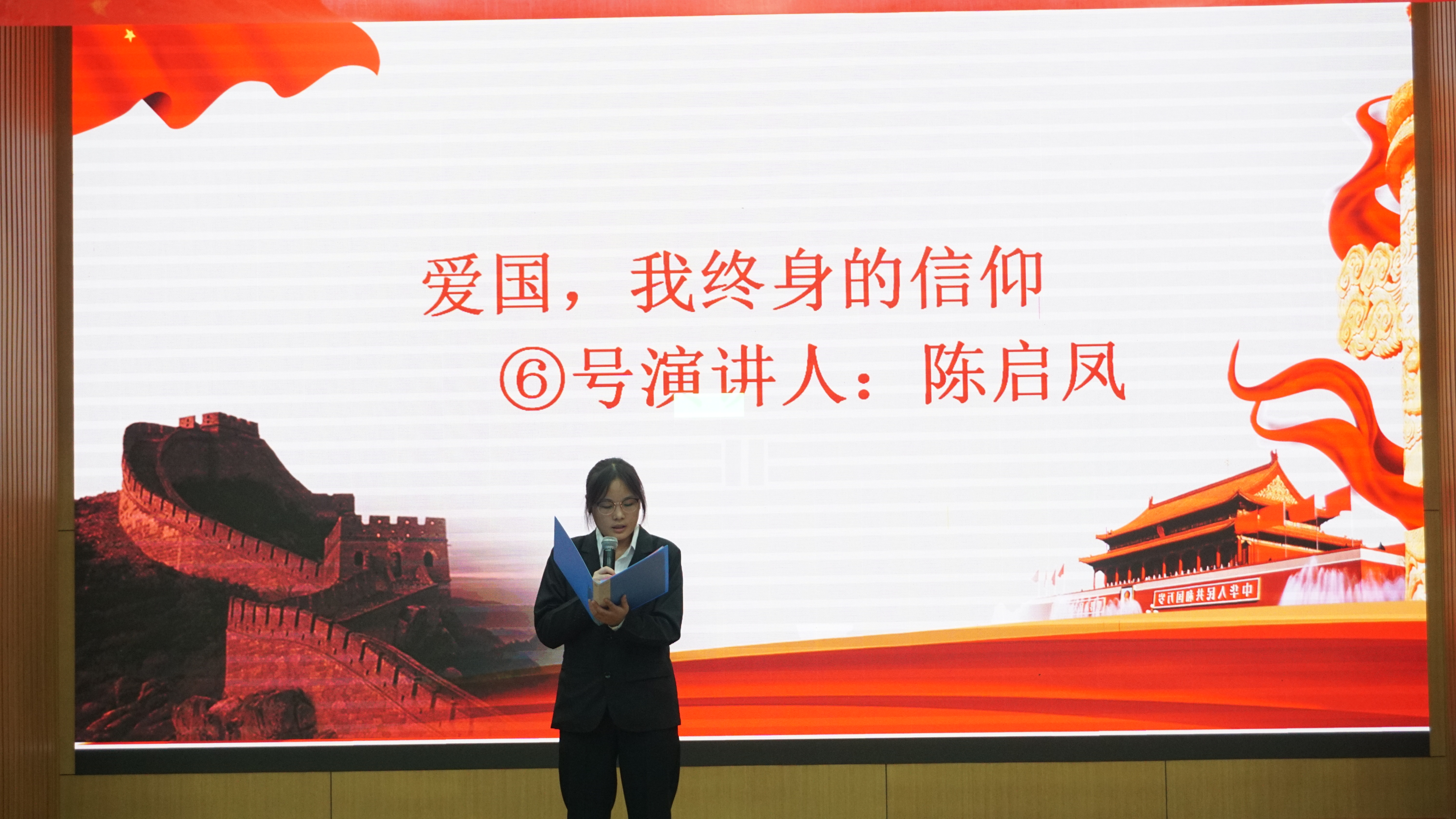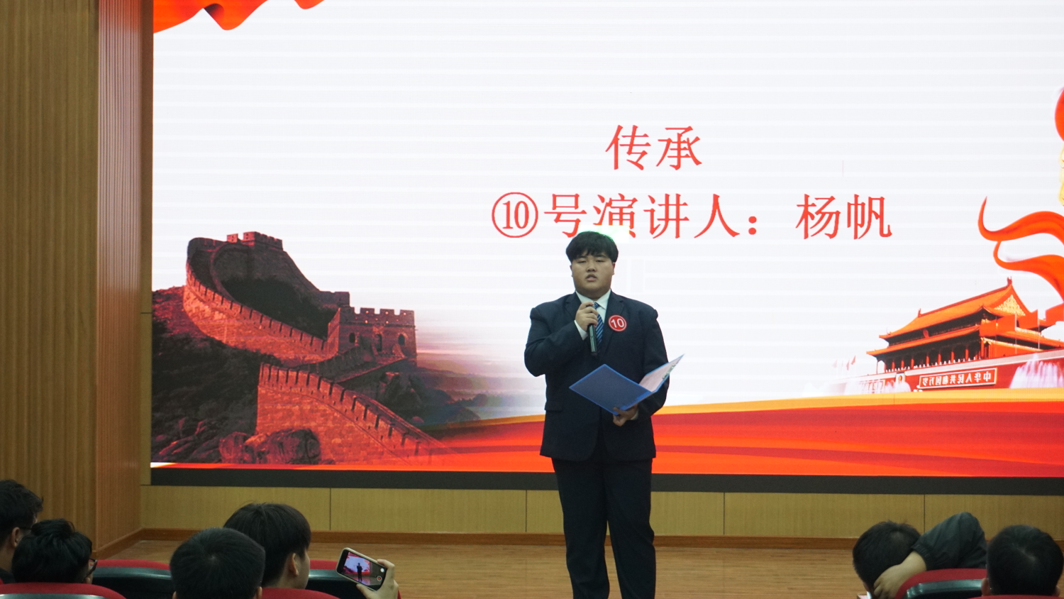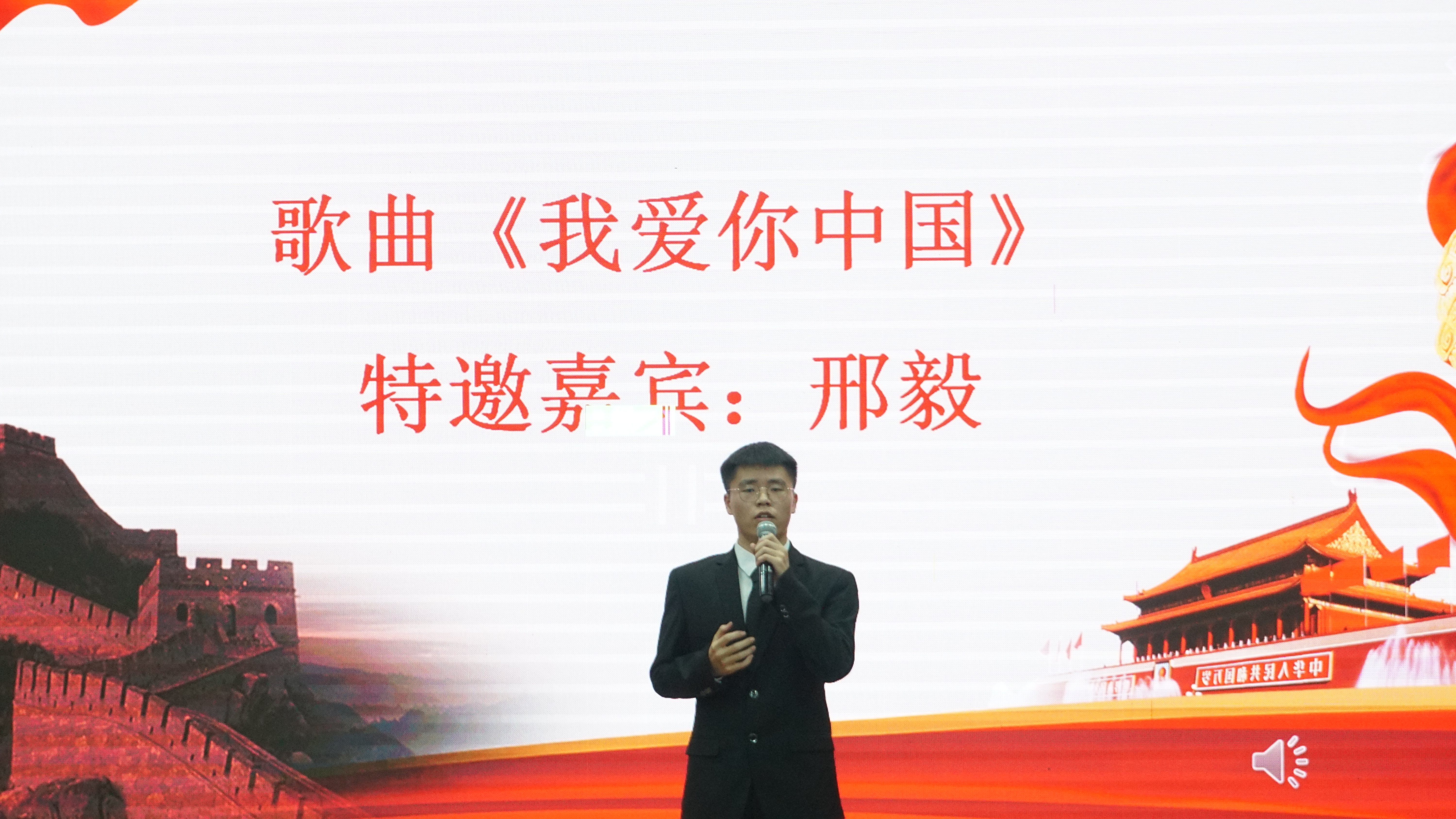 演讲过半,由特邀嘉宾通信2101刑毅带来歌曲《我爱你中国》,以热情洋溢,温柔动听的歌声表达出了自己对于祖国的热爱,同时牵动着在座老师、同学们的爱国之心。