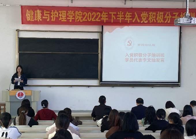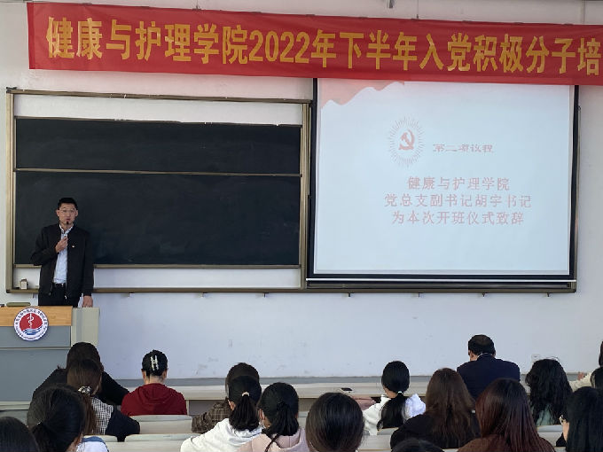 第二项议程:健康与护理学院党总支副书记胡宇书记为本次开班仪式致辞,他指出:健康与护理学院的发展逐渐壮大,入党积极分子培训班的成员人数达到指标,从最初与其他学院合作办班到如今独立开班,告诫在场的入党积极分子要关心国家大事,争做表率,甘于为他人和学院奉献,并要有效管理好学习时间和工作时间。在场的很多都是学生干部,更要严上加严要求自己。