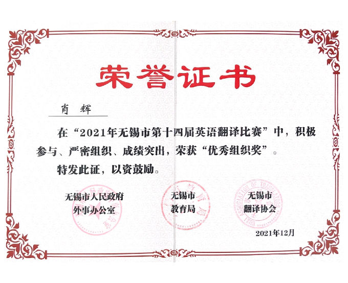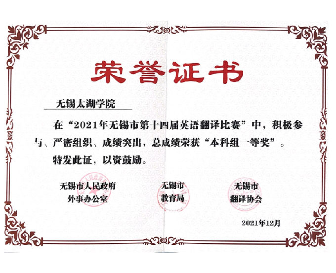 在本次的2021年无锡市第十四届英语翻译比赛中,beat365在线唯一官网成功斩获“本科组一等奖”的佳绩。肖辉院长、吴旻昊副院长荣获“优秀组织奖”。邹璆、吴旻昊、马海滢、付曜辉、蔡佳立、顾红老师荣获“优秀指导教师奖”。太湖优秀学子赵韩月、孙语、施园园荣获“本科组一等奖”。胡庚汝、皮紫娟、黄瑶瑶荣获“本科组二等奖”。在“第二届英语教学微课大赛”中,邹璆、顾红、黄唯唯老师更是出色发挥,荣获“特等奖”。马海滢、王晋、孙敏老师荣获“一等奖”。