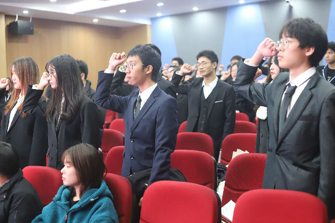 第六项议程,由新一届学工助理团主席王嘉鑫带领智能建造学院学工助理团、新媒体中心全体成员进行宣誓。