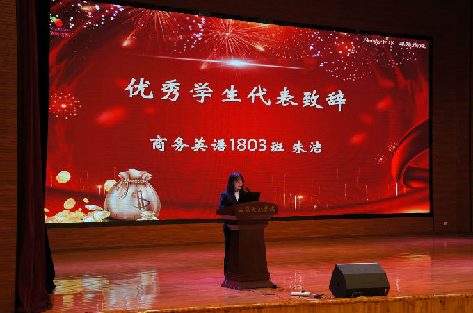 接着分别由优秀学生代表商务英语1803班朱洁同学发言。她鼓励大家“天行健,君子以自强不息;地势坤,君子以厚德载物”。然后由新生代表法学2103班琚靖邦同学发言。他给大家讲述了在部队中的经历,坚定了什么是使命担当。然后由2013级优秀校友王诏炜律师发言,用自己在大学里的蜕变历程和毕业后取得的成绩激励学弟学妹们,未来掌握在自己手中。