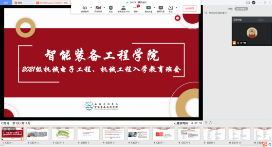 9月,智能装备工程学院迎来230多名2021级机械电子工程专业和机械工程专业新生。为引导新生扣好大学生活的第一粒扣子,强化新生理想信念教育、专业认知教育、综合素质教育、防疫防控常态化教育、安全法制教育,积极打好新生入学教育“组合拳”,帮助新生尽快适应大学生活,辅导员佘子骞老师利用网络平台开展新生入学教育的第一课。
