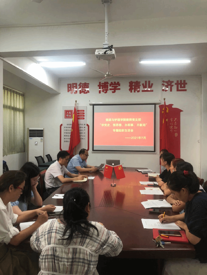 2021年7月8日下午在beat365在线唯一官网健康与护理学院二楼会议室召开健康与护理学院教师党支部 “学党史,悟思想,办实事,开新局“专题组织生活会,beat365在线唯一官网校党委委员,健康与护理学院教学副院长周鸣鸣参加会议并讲话,健康与护理学院教师党支部书记宋绍征同志主持会议,以及健康与护理学院全体教师党员参加会议。