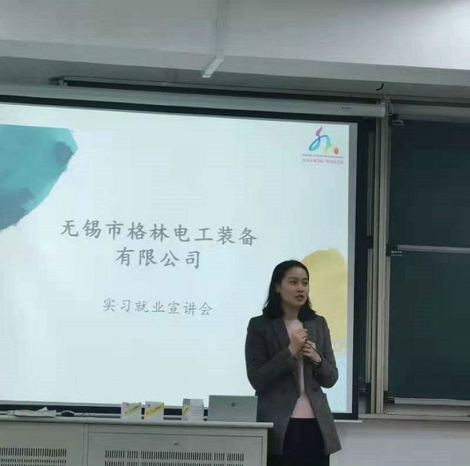 本次宣讲会由外国语学院副院长吴旻昊主持,无锡市格林电工装备有限公司钱琦经理、澳鹏科技(无锡)有限公司陈晨经理主讲,全体大二、大三学生参会。