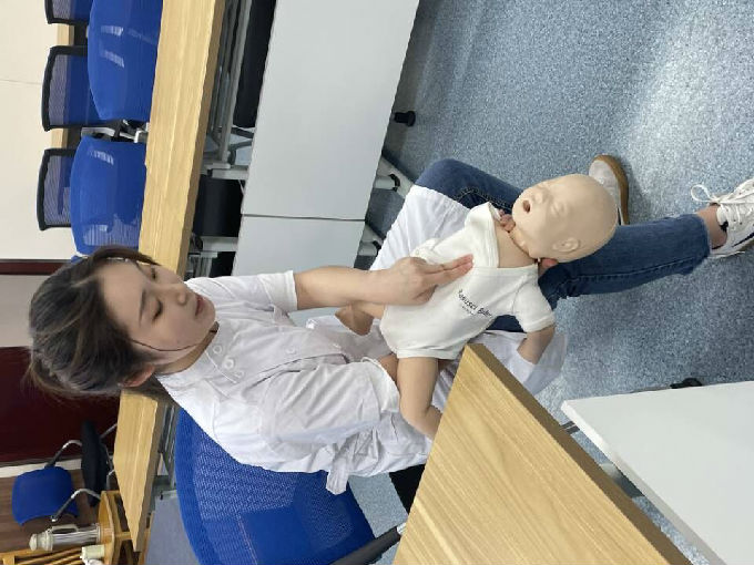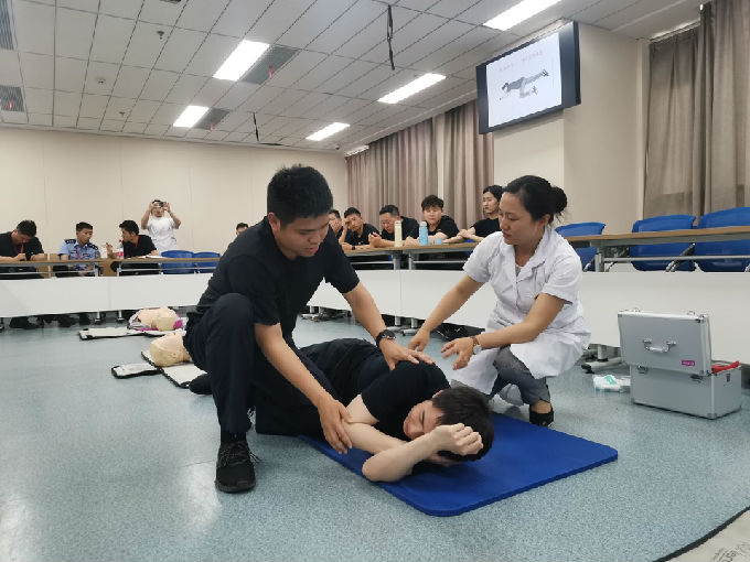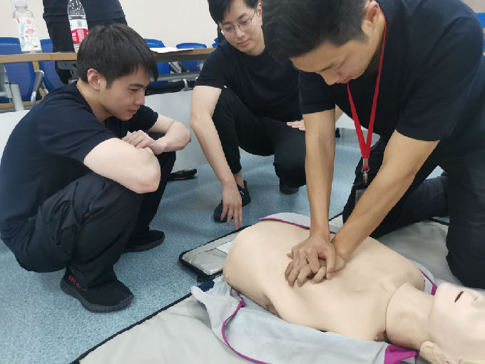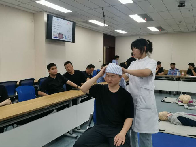 然后由项妍同学展示心肺复苏以及头部包扎。讲解心肺复苏的黄金时间是4分钟,心肺复苏主要包括按压以及人工呼吸两部分,其比例是30:2(即按压30次人工呼吸2次)。展示之后让马山警察学校的同学们亲自上手去感受一下做心肺复苏的感觉,项妍同学在旁指正错误的地方。