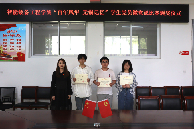 为深入学习贯彻习近平新时代中国特色社会主义思想,隆重庆祝中国共产党成立 100 周年,智能装备工程学院于3月底至4月中旬在学院内展开“百年风华 无锡记忆”主题学生党员微党课比赛。4月29日,智能装备工程学院在学院会议室组织召开本次比赛的总结暨颁奖仪式,与会的有智能装备工程学院党总支副书记杨学圣,学生党支部书记许心怡,学生第二党支部书记、团总支书记丁苗,以及全体学生党员,邀请校党办辛怡老师作为嘉宾参会。