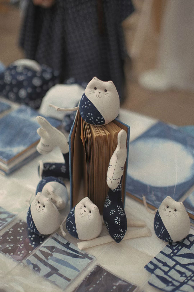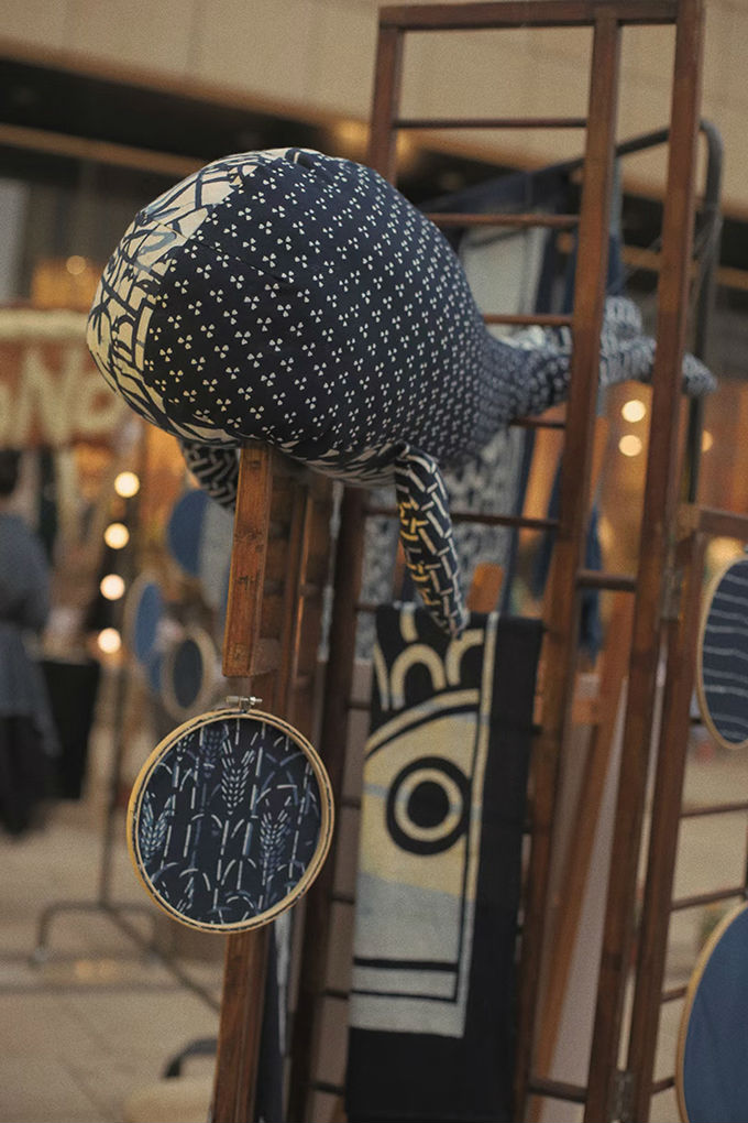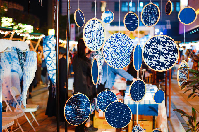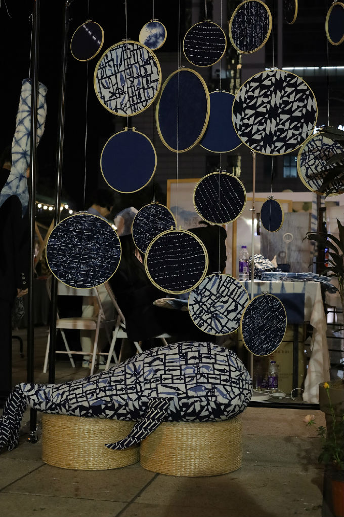 市集在下午开始,随着时间推移,光影发生变化,我们的展品也呈现了不同的变化。在夜间,蓝印花布,静谧而深沉,笼罩着一层神秘色彩,而在灯光下的照耀下,蓝印花布似乎也散发着光芒,给人温暖。