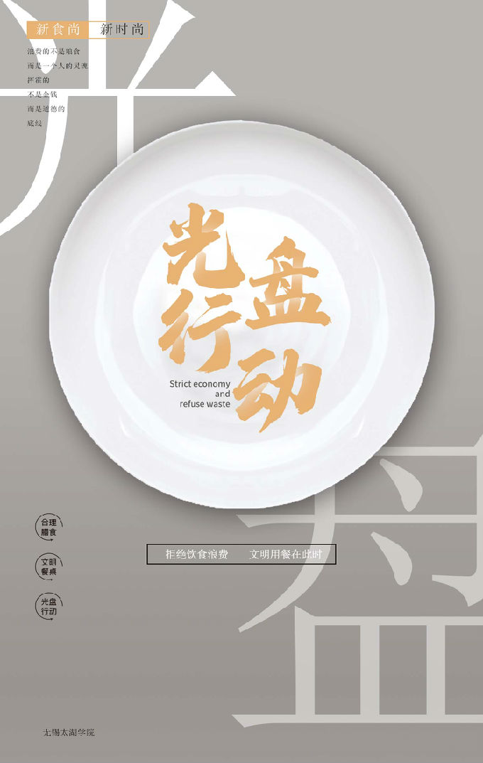 此次活动主要是围绕“践行光盘·文明用餐”的主题,开展海报设计比赛。艺术学院内外张贴了宣传海报和宣传标语,并主动向师生宣传"新食尚"引领节约,携手文明,告别陋习,并主动作为、率先垂范,自觉肩负起倡导勤俭节约好习惯的责任和使命,带头发扬艰苦朴素、艰苦奋斗的优良作风,赢得了学生的赞誉。此次活动受到同学们的积极响应,共收到50份海报,通过对海报进行评选,最终评审出一等奖1名,二等奖5名,三等奖10名,在学院进行宣传展示。