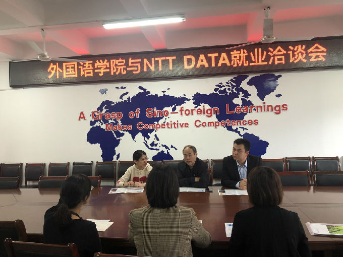 2020年11月18日下午,外国语学院院长包通法、党总支副书记俞昊波、日语系副主任李健雄在学院会议室热情接待了无锡NTT DATA有限公司人事部部长陆俊闻等公司领导一行。