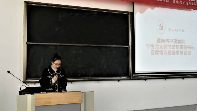 第三项议程,健康与护理学院学生党支部书记陈春晓宣读培训班要求与细则。“通过对入党积极分子进行集中的、系统的培训,使学员加深对党的基本知识和习近平新时代中国特色社会主义思想的了解和认识;坚定共产主义理想和中国特色社会主义信念,增强“四个意识”、“四个自信”,树立正确的入党动机;自觉按照党员的标准严格要求自己,践行社会主义核心价值观,在思想上和行动上积极向党组织靠拢。”
