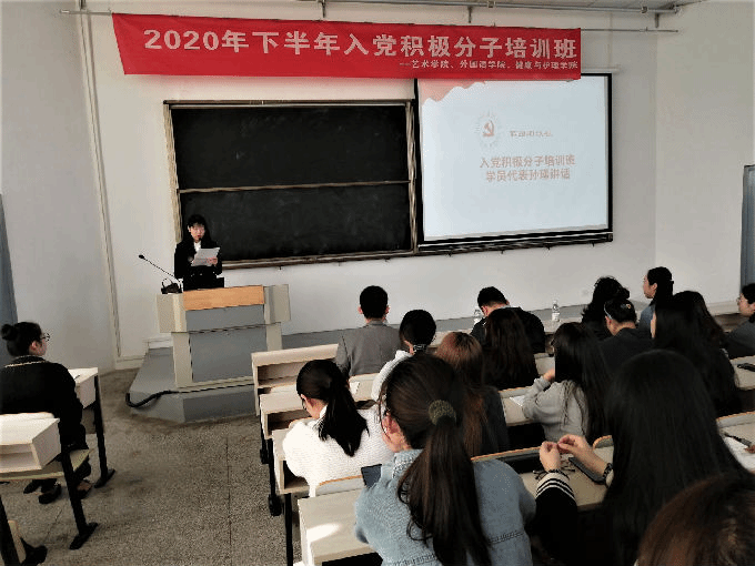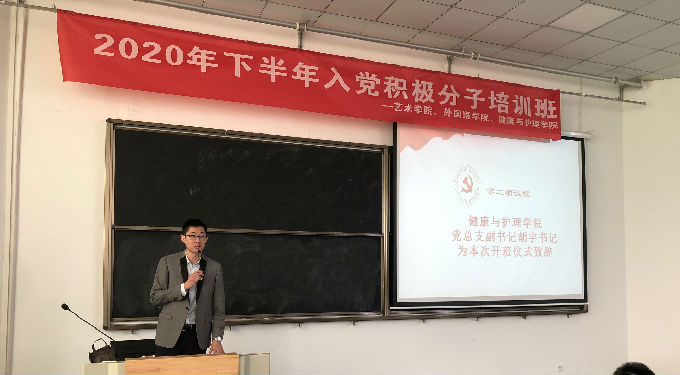 2020年11月2日,艺术学院、外国语学院、健康与护理学院2020年下半年入党积极分子培训班在教学楼5号楼318教室举行了开班仪式,艺术学院党总支副书记武蓓蓓书记、外国语学院党总支副书记俞昊波书记、健康与护理学院党总支副书记胡宇书记、马克思主义学院荣昭俊副教授及全体学员参会。培训班旨在加深学员对党的认识、端正入党动机、坚定入党决心,从思想和行为两个方面严格要求自己,争取早日加入党组织。