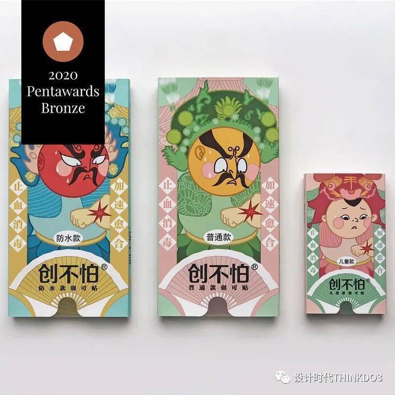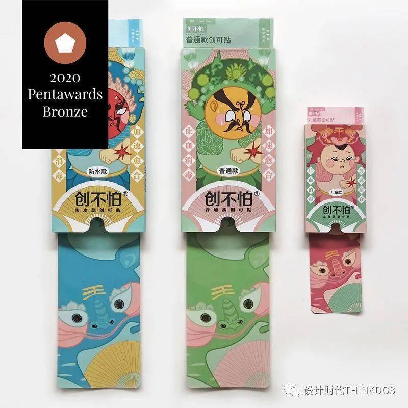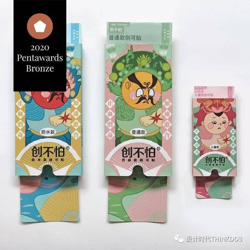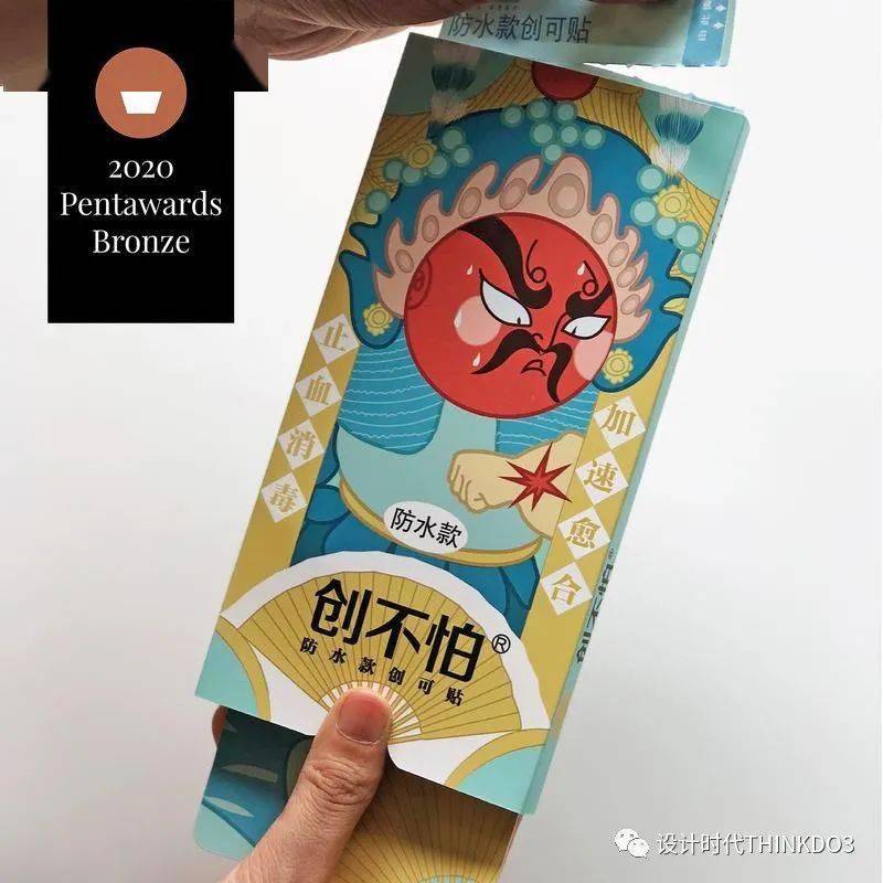 《创不怕》创可贴包装通过“门神-手上有伤即用创不怕”的创意来传递产品信息。利用夸张幽默的表情使严肃的医疗产品变得惹人喜爱,以产生使用对象心理上的消费共鸣。包装的结构采用了抽拉式,使用时产品可自动伸出,在用完后又可以给孩子作为玩具。