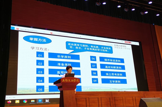 最后袁惠新院长为2020级新生带来了题为《将来= 𝒇(现在)》的入学教育主题报告。报告分为“学校学院简介、学习目的WHY、装备种类WHAT、我和你怎么做HOW”四个部分,学院以“乐教传道 乐学修身”为学院精神,践行双因施教—因材施教与因需施教相结合,分类培养新工科应用型本科人才的培养理念。要求所有新生了解所学范畴,明确学习目标,定下毕业要求,领悟求学意义,勉励同学们在今后的求学与人生道路上,谨记师长教诲,有责任、有担当,心怀高远、自强自立,以真才实学回报社会,用实际行动为母校增光添彩。