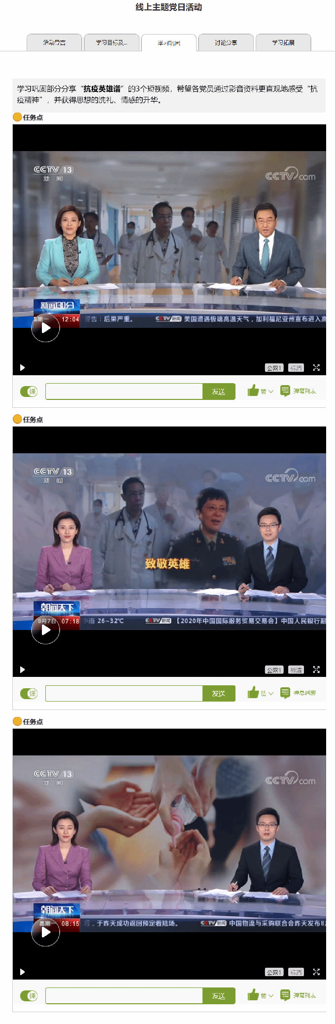 在学习巩固部分,党组织同各党员分享了“抗疫英雄谱”的3个短视频,包括“共和国勋章”获得者钟南山院士的事迹简介,“人民英雄”国家荣誉称号获得者中的唯一一个军人陈薇院士的事迹简介以及全国人民共同抗疫的先进榜样的事迹简介。各党员通过影音资料能更直观地感受“抗疫精神”并获得思想的洗礼、情感的升华。