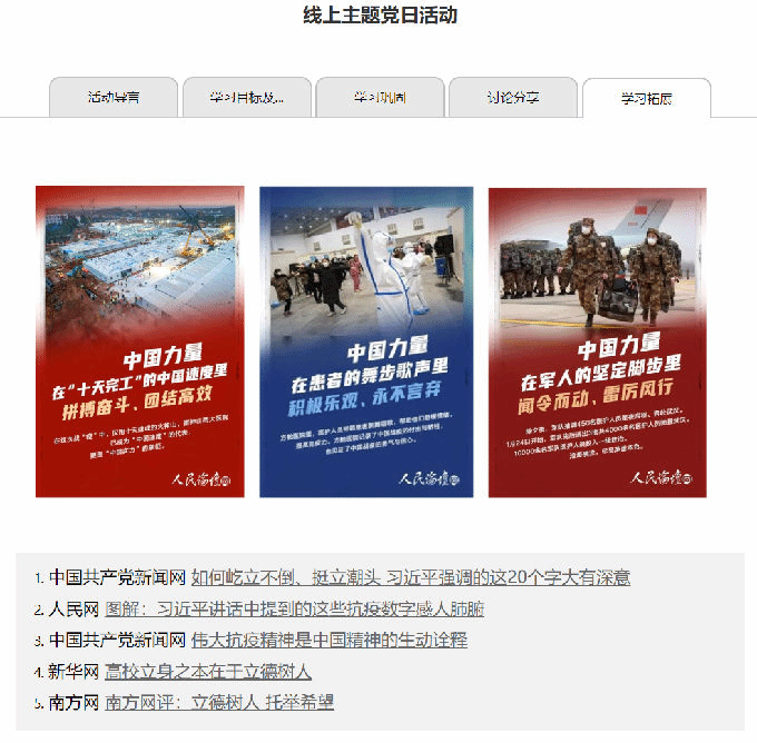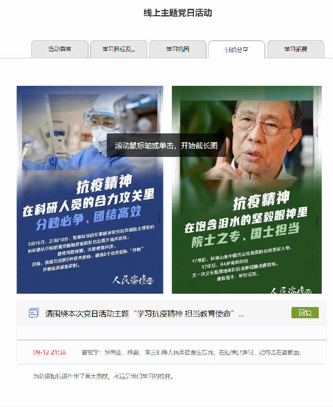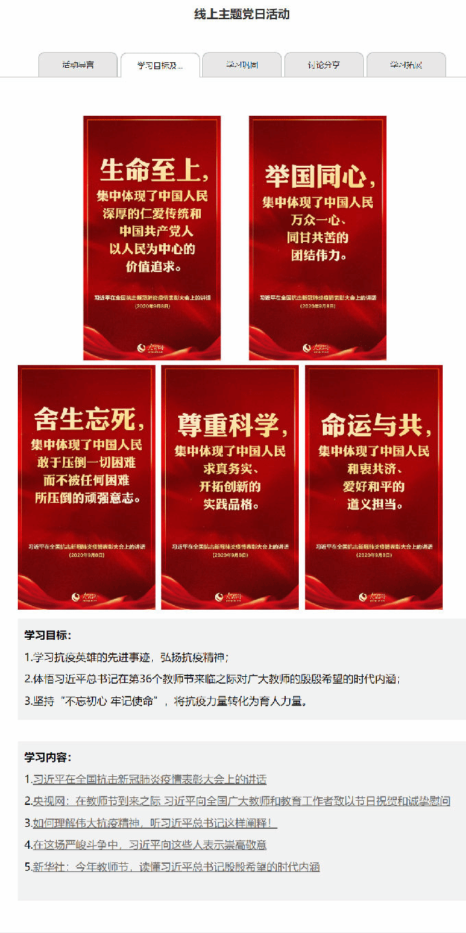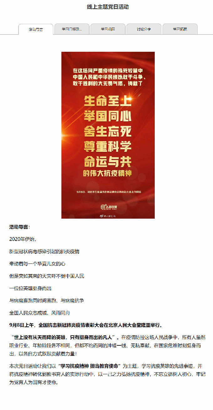 活动伊始,活动导言版块的图片就将所有党员带入了本次党日活动的主题情境之中,红底黄字的宣传海报中的宣传语句振奋人心:“在这场同严重疫情的殊死较量中,中国人民和中华民族以敢于斗争、敢于胜利的大无畏气概,铸就了生命至上、举国同心、舍生忘死、尊重科学、命运与共的伟大抗疫精神。”
