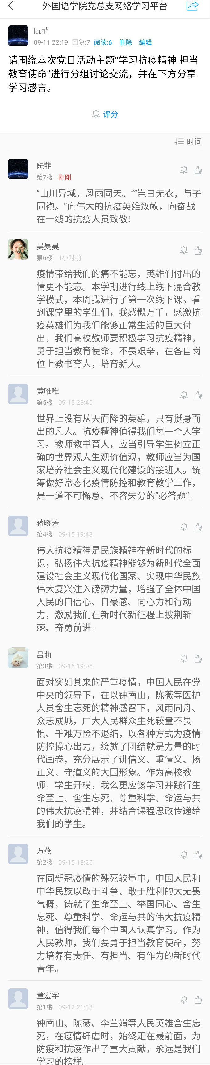 根据学校疫情防控的部署安排以及校党委新学期党建工作的具体要求,为了深入学习、贯彻习近平总书记在全国抗击新冠肺炎疫情表彰大会上的讲话的重要精神,9月17日下午13:30,外国语学院教师、教工党支部通过网络学习平台开展了“学习抗疫精神 担当教育使命”九月线上主题党日活动。活动由教师党支部书记董宏宇同志主持、党总支宣传委员阮菲同志负责组织,全体教师、教工党员积极参加了此次活动。
