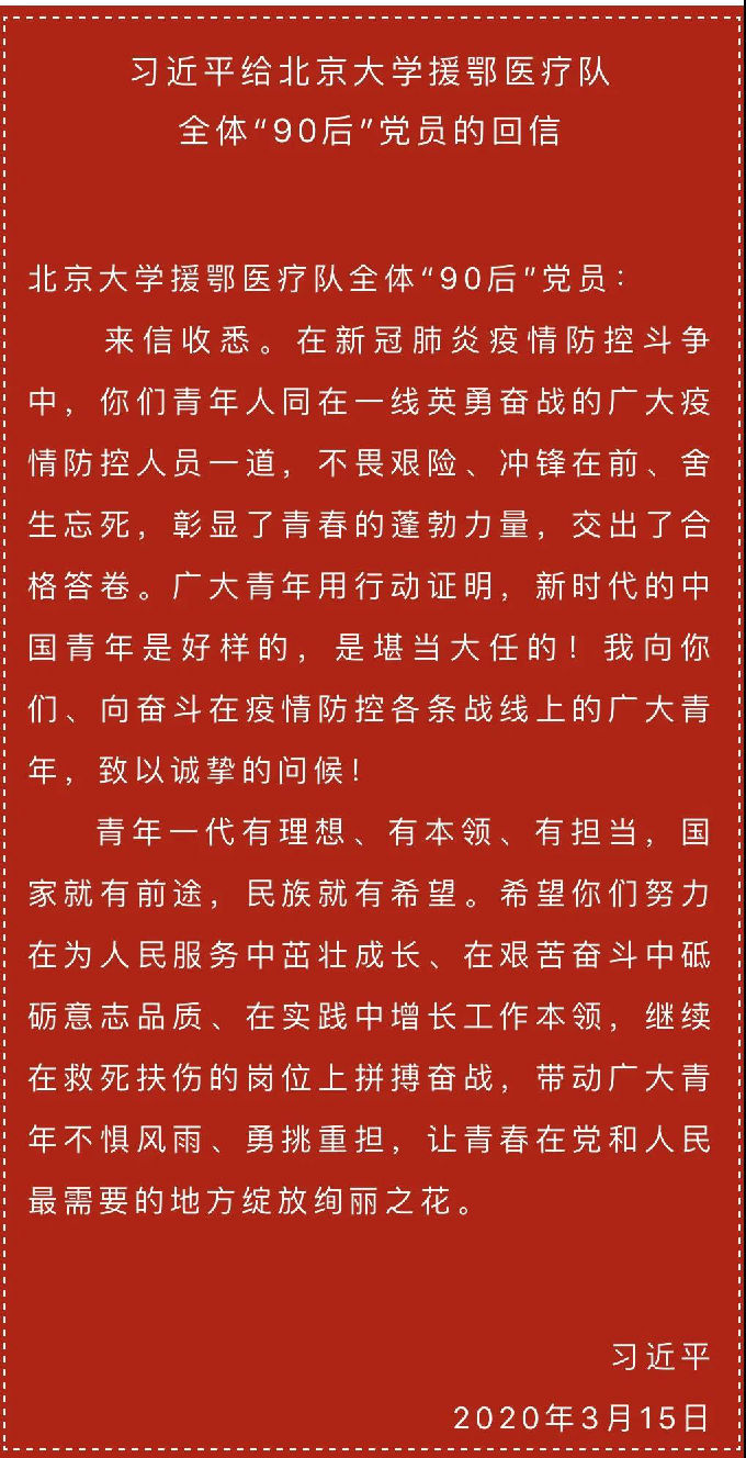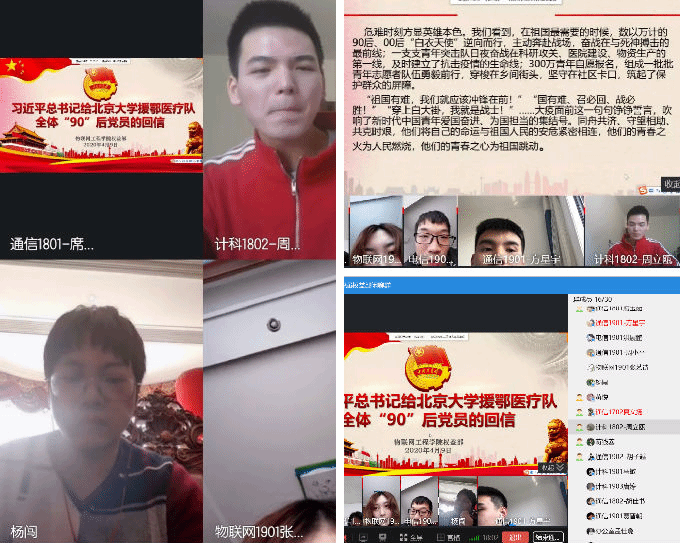 2020年4月9日,物联网工程学院学生分会积极响应号召,开展了《习近平总书记给北京大学援鄂医疗队全体“90后”党员的回信》主题线上学习活动。