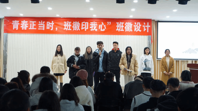 大赛开始,各个班级按照抽签顺序依次上台讲演,向现场评委、观众介绍展示自己班级的班徽设计。本次大赛采取线上微信投票和活动现场评委打分相结合的评分方式,待各班级展示结束后,由现场工作人员对线上线下分数进行统计,得出每个参赛班级的最终成绩。