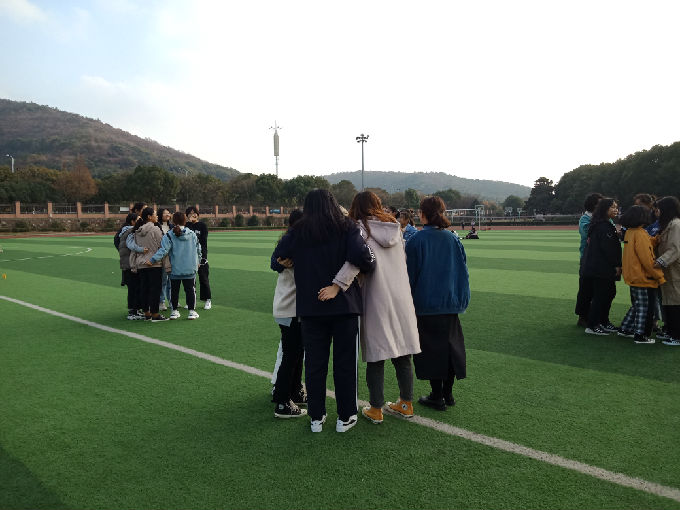 第二个活动是“站如松”,规则是两个人相对而站,伸出双掌相抵,使对方脚掌离位即为胜利。大家互相推着,有的一推就倒,有的僵持不动,还有的直接扑在对方身上。在游戏过程中大家似乎明白了原来女生还是有如此大的力气,便纷纷伸出双手抱拳表示佩服。