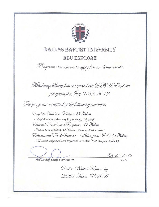 中外合作交流--暑期创新实践项目于每年暑期的7月开始,以物联网工程学院为主的师生访学团会出发前往美国达拉斯浸会大学(Dallas Baptist university,DBU)开展为期三周的访学交流活动。访学的内容包括语言,文化,历史,经济,法律,前沿科技等。参加该实践项目的学生完成课程后,学生将获得课程结业证书和相应实践学分。