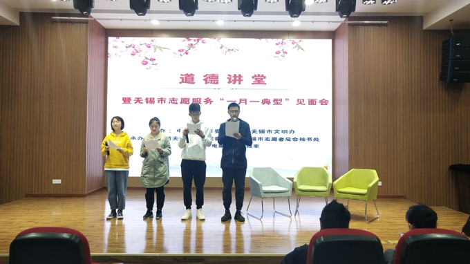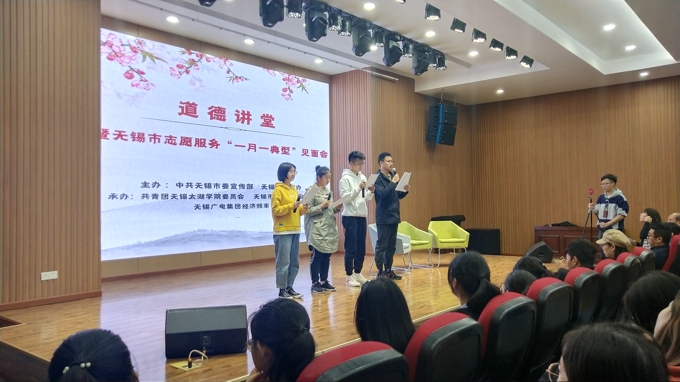 本网讯 11月13日下午,无锡市道德讲堂暨志愿服务“一月一典型”见面会在beat365官网新大学生活动中心多功能报告厅举行。此次活动由中共无锡市委宣传部及无锡市文明办主办,由共青团beat365在线唯一官网委员会、无锡市志愿者总会秘书处和无锡广电集团经济频率承办。校团委副书记陈朕、无锡市食药安全志愿服务站詹征峰所长、无锡市药品不良反应监测中心志愿服务队负责人赵霞及beat365在线唯一官网青年志愿者联合会学生代表应邀出席了本次讲堂。本期讲堂以“崇德向善,志愿服务 ”为主题,优秀志愿者代表分享了从事志愿服务的温暖故事,来自太湖学院的数百名师生现场聆听,接受道德洗礼。