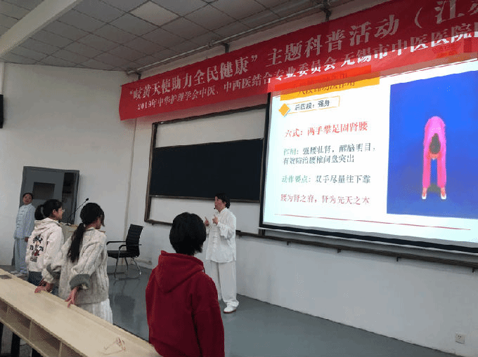 随后,无锡市中医院的医生和护士带领学生一起学习“八段锦”,理论与实践相结合,以全新的方式学习到了健身知识,并达到了疏松经络,强健筋骨,强壮内脏的效果,收获满满。最后,叶志超处长对此次活动进行总结发言,表达了对中医药文化发展的希望。
