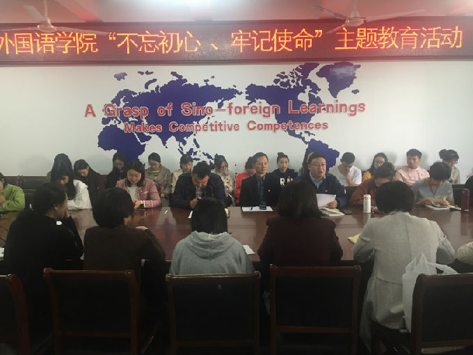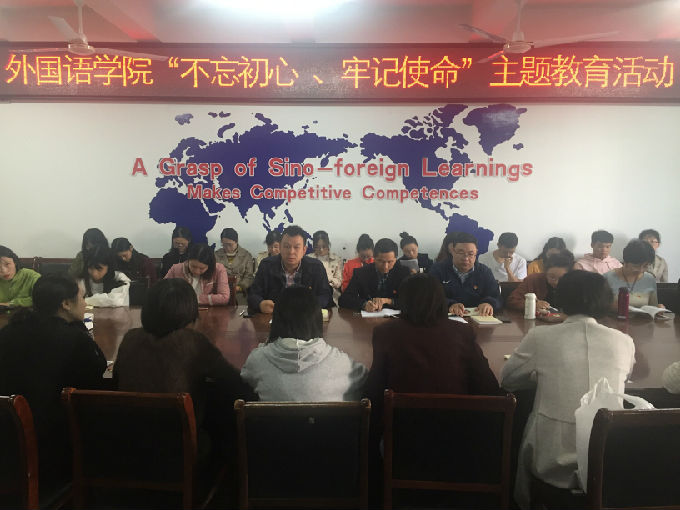 10月30日中午,外国语学院教师党支部、教工党支部、外语学生党支部全体党员在二楼会议室召开了“不忘初心、牢记使命”主题教育集中学习研讨会。会议由党总支副书记俞昊波主持。