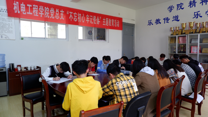 为贯彻落实“不忘初心、牢记使命”主题学习教育,检验学生党员主题教育学习成果,10月18日,机电工程学院学生党支部及学生第二党支部在学院楼会议室举行“不忘初心、牢记使命”主题教育应知应会测试。两个支部全体学生党员参加了此次测试,支部书记许心怡、丁苗全程参与监考。