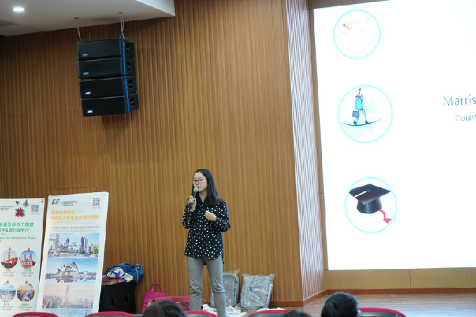 在讲座正式开始之前,肖敏聪老师进行了自我介绍并对自己的学术背景作了简单的介绍,她曾在复旦大学学习,并具有韩国高丽大学、新加坡国立大学的留学经验,此外,她还攻读了MBA课程。接着,她通过往期活动图片展示对英孚(EF)国际教育集团的海外游学留学项目进行了详细介绍。然后,她又介绍了英孚历史及英孚使命,让同学们更好地了解英孚教育。通过肖老师的介绍,同学们大致了解了英孚教育大学生游学课程的课程优势、所涉猎的国家、语言及可从中收获的履历等。