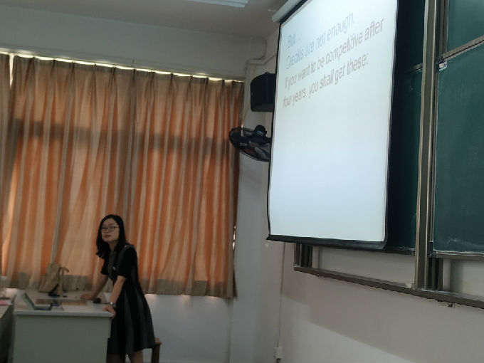 接着,邹璆老师讲解四年规划供同学们参考。大一过渡期,在不断的学习和自我认识中明确目标;大二忙碌期,充实自己,提高自我素养;大三冲刺期,学以致用,在实践中弥补自身的不足;大四定位期,整合专业知识和能力,定位工作方向。在计划与学习中摸索,使自身的知识学习、能力培养、特长培养、人际交往、体育锻炼得到全面的提高,不负大学四年美好时光。