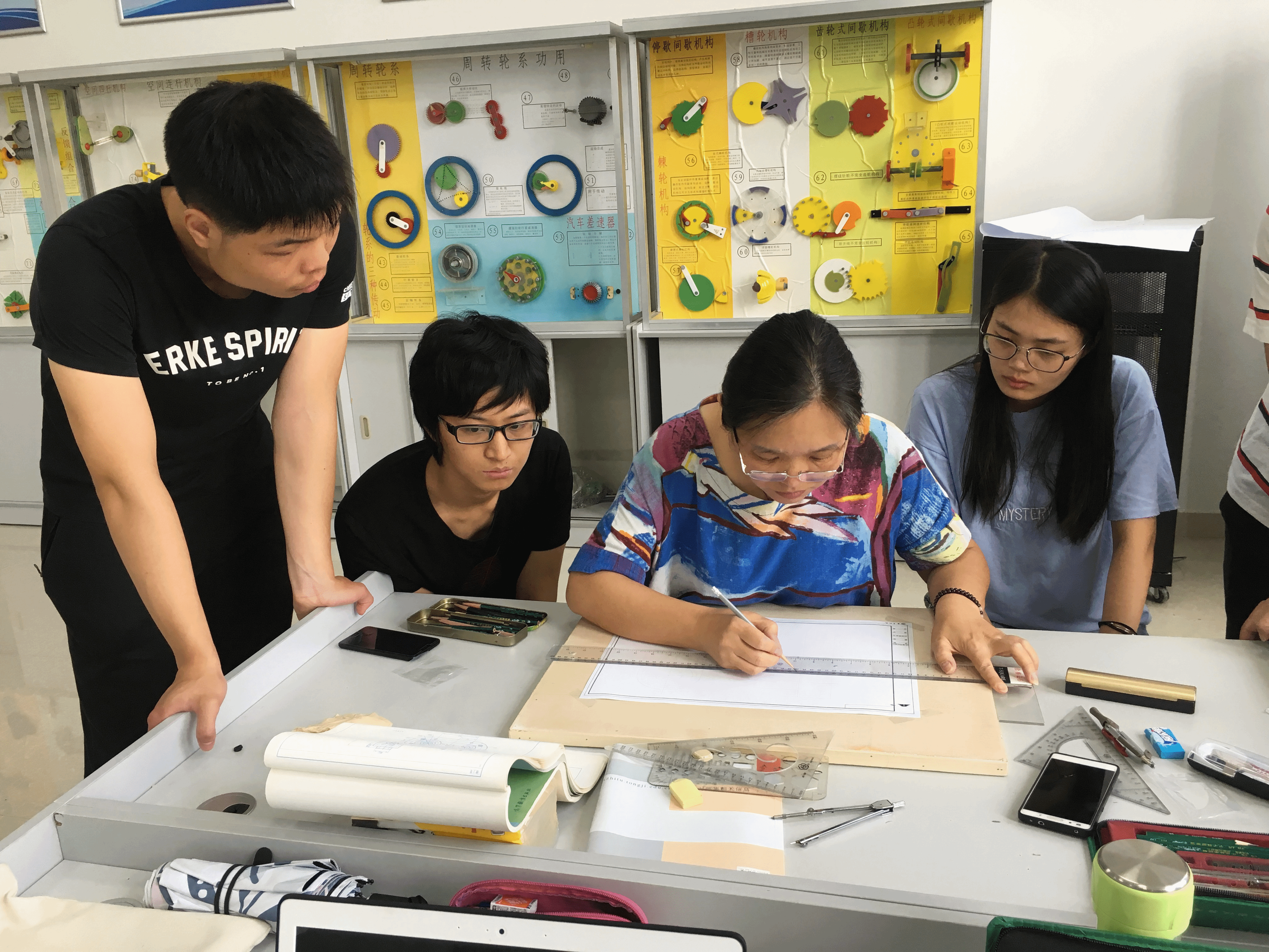 首先从工具的准备开始,要保证尺子的干净,以免影响图纸的整洁,绘图过程中,同学们都静静围绕在桌旁,仔细观察俞老师的绘图方法,俞老师也会强调画图中需要注意的一些细节,比如绘图的先后顺序、线型、圆角、标注等应如何将其绘制得更完美。尺规绘图的经验与技巧并非一朝一夕就能积累的,尤其是在现在各种软件制图代替尺规绘图的时代,尺规绘图很容易被忽视,俞老师有着丰富的制图经验,此番教学与讲解让同学们提早发现了自己在尺规绘图过程中的一些坏习惯,受益匪浅。