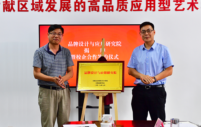 随后举行揭牌仪式。由陈鹏飞副校长和曹洪东会长为“无锡品牌设计与应用研究院”揭牌。由唐平湖文化旅游发展有限公司董事长高海荣和艺术学院副院长朱宗明为无锡品牌设计与应用实践基地揭牌。