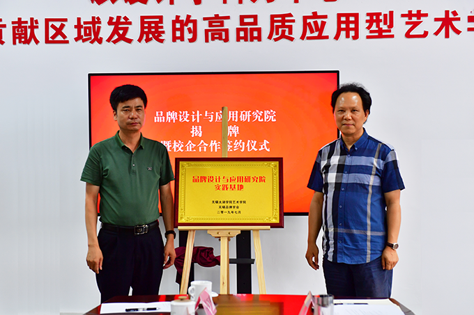 艺术学院副院长朱宗明和唐平湖文化旅游发展有限公司董事长高海荣代表无锡品牌设计与应用研究院与唐平湖文化旅游发展有限公司签约。