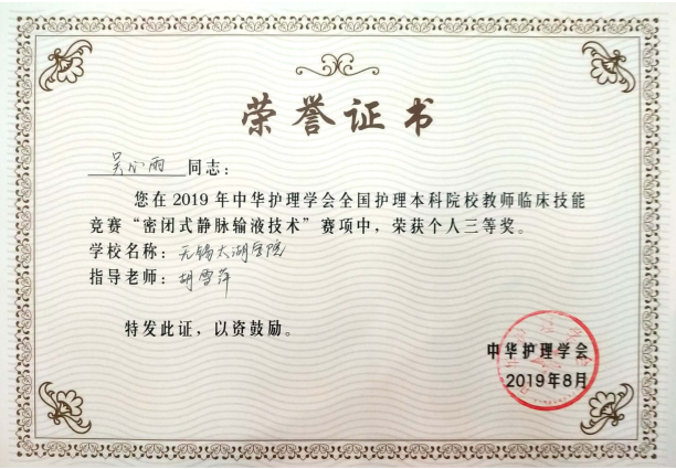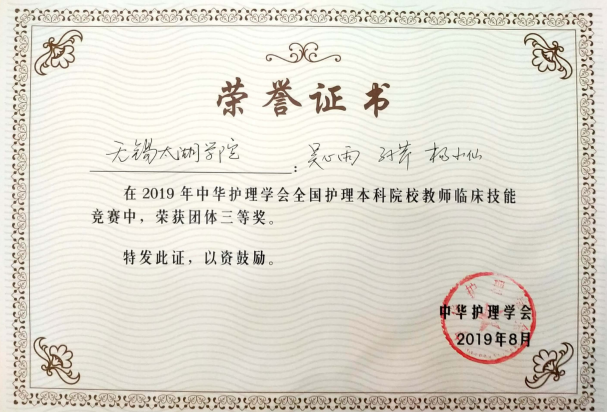 beat365官网由周鸣鸣副院长领队,无锡市第二人民医院护理部主任胡雪萍主任护师作为指导教师,护理学院杨小仙老师、吴心雨老师和无锡市第二人民医院ICU孙芹老师为参赛选手。在各级领导的关心下,经过一个多月的紧张训练,代表队在现场沉着冷静,以扎实的理论功底、精湛的临床技术、良好的团队合作顺利完成比赛,取得了密闭式静脉输液技术单项操作三等奖、心电监护单项操作三等奖、单人心肺复苏单项操作三等奖、团体三等奖的好成绩。这是护理学院在学校党政领导下,不断加强与教学医院合作,提高教师素质和临床思维能力,深化医教协同育人的重要成果。