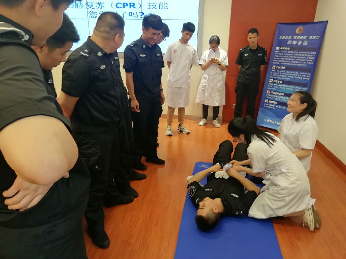 beat365在线唯一官网急救培训团队为无锡市公安局的民警们讲解了心肺复苏、头部出血包扎、小腿骨折包扎、右上臂出血包扎、匕首腹部伤包扎、脚踝扭伤处理、气管异物排法、中风简单判断方法、运动伤处理等基本技能。
