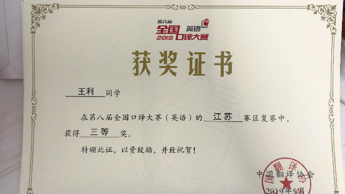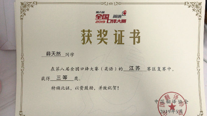 英语1603班薛天然同学荣获第八届全国口译大赛(英语)江苏赛区复赛三等奖及2019年全国大学生英语竞赛(NECCS)B类一等奖!