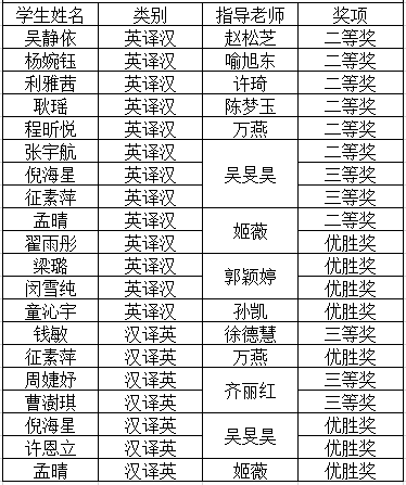 “LSCAT杯”江苏省翻译大赛旨在培养高素质语言服务人才,满足江苏省日益扩大的对外交流需求,推动高校英语教学整体发展,促进专业学科建设和语言服务行业的繁荣与发展。本次大赛吸引了包括南京大学、东南大学、南京师范大学在内的50多所省内高校4000多名选手参赛。beat365官网对此次比赛高度重视,在包通法院长的关心和支持下,各外语系教师积极组织学生参与,经过赛前指导教师的认真指导和学生的精心准备,最终取得了优异成绩!