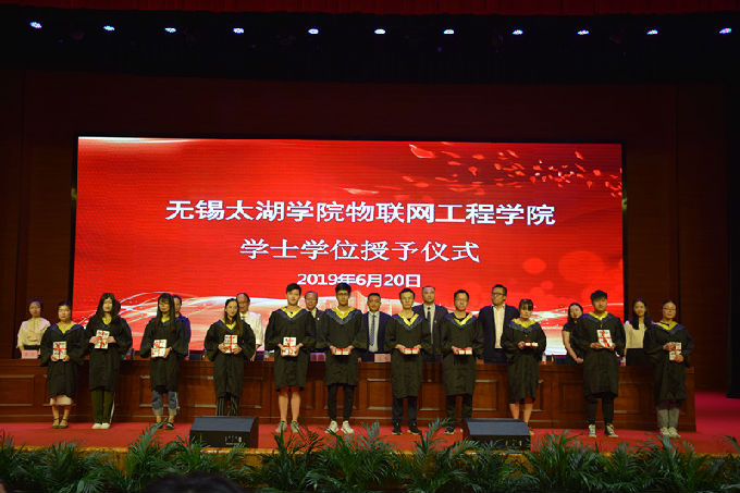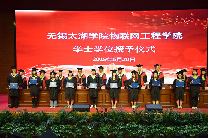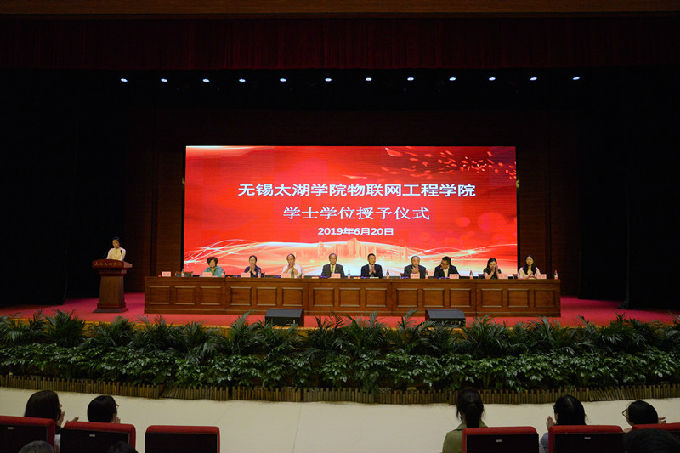 2019年6月20号下午,物联网工程学院2019届本科毕业生学士学位授予仪式在校工科实验大楼报告厅隆重举行。物联网工程学院院长惠晶、党总支副书记沈峰、副院长方宁生、副院长李莎、徐平平教授、陈国俊教授、方光辉教授、王华君教授、姚湘老师、尚弘老师在授予仪式主席台就坐,学院所有教职工、2019届全体毕业生出席会议,由物联网工程学院副院长李莎主持本次授予仪式。