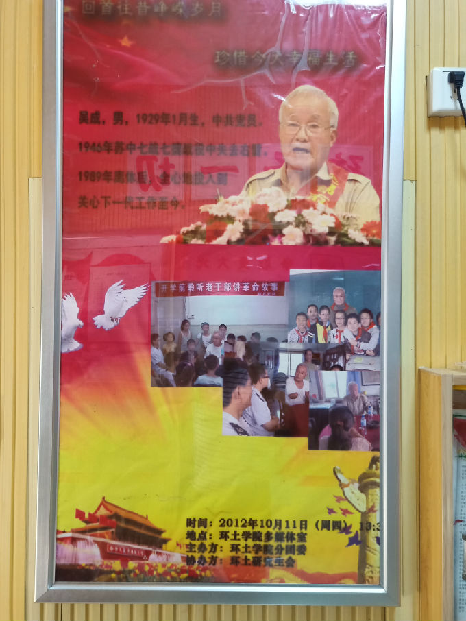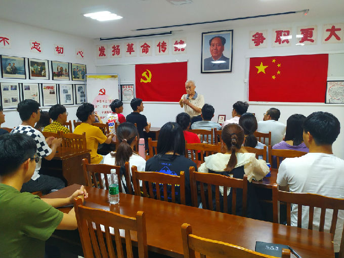 吴成老先生向我们介绍了井冈山革命根据地的建立、长沙起义、毛泽东“农村包围城市”等思想,让我们真切的感受到中国共产党建立初期的不易。随后吴老还向我们讲述了他青年时期参加战争的一段刻骨铭心的经历。去年吴老再次故地重游,去往当年老排长的家乡带回了当地的水土以纪念自己的青春。最后吴老结合习近平新时代中国特色社会主义思想对在座的同学们提出要求,作为当代青年,同学们要以青春书写时代责任,用双手实现伟大中国梦。