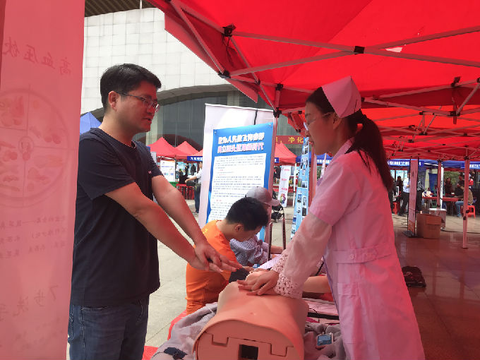 现场还进行了心肺复苏技能训练,心肺复苏的模拟人所连接的仪器可以精确反应按压的深度、回弹和频率是否准确,志愿者们细致生动地讲述了心肺复苏术的应用场景、应用方法等。在演习如何心肺复苏时,有许多市民在一旁跃跃欲试,亲自尝试了心肺复苏术,希望能在紧急情况下挽救家人或他人的生命,也为身边的人增添一份保障。
