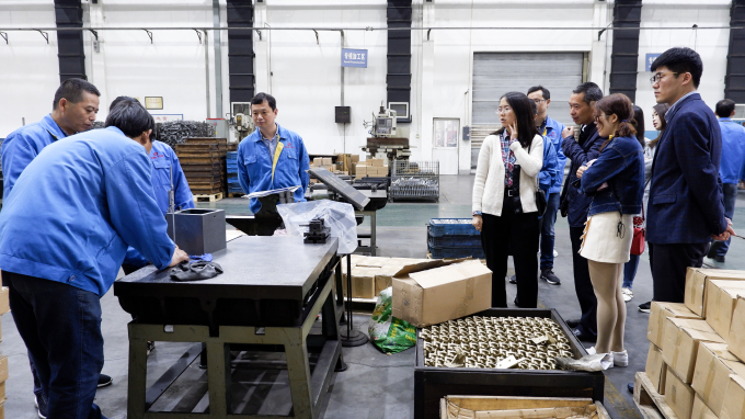 在宏源机电科技股份有限公司对beat365官网一行的到来表示热烈欢迎后,公司党委副书记王伟为、技术党支部书记付光怀带领beat365官网党员及骨干教师对公司工厂车间进行了参观,并介绍了公司在纺织机械领域所取得的一系列研究成果。