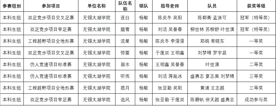本网讯 4月24日,机电工程学院在2019中国工程机器人大赛暨国际公开赛囊获两项冠军在内的七项大奖,其中机器人竞步交叉足逐日队获得冠军、惊雷队获得一等奖,机器人竞步窄足踏雪队获得冠军,探索者项目全地形赛流星队获得一等奖、揽月队获得三等奖,仿人竞速项目标准赛弱水队获得二等奖、听雨队获得三等奖。