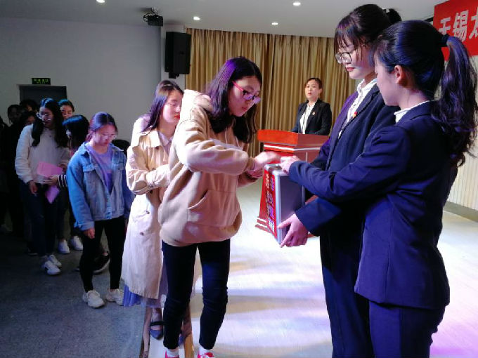 大会监选组从大会主席团分别领取选票,当场向在座代表示意保密文件、并检验票箱开箱以示代表,检验无问题后封箱,以保证投票公正透明。现场工作人员从监选组分别领取选票并分发给在座学生代表,学生代表填选完毕后依次进行投票,第一轮投票产生新一届护理学院分团委副书记一职。